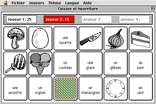 Ici un écran en Français, thème Cuisine et Nourriture: